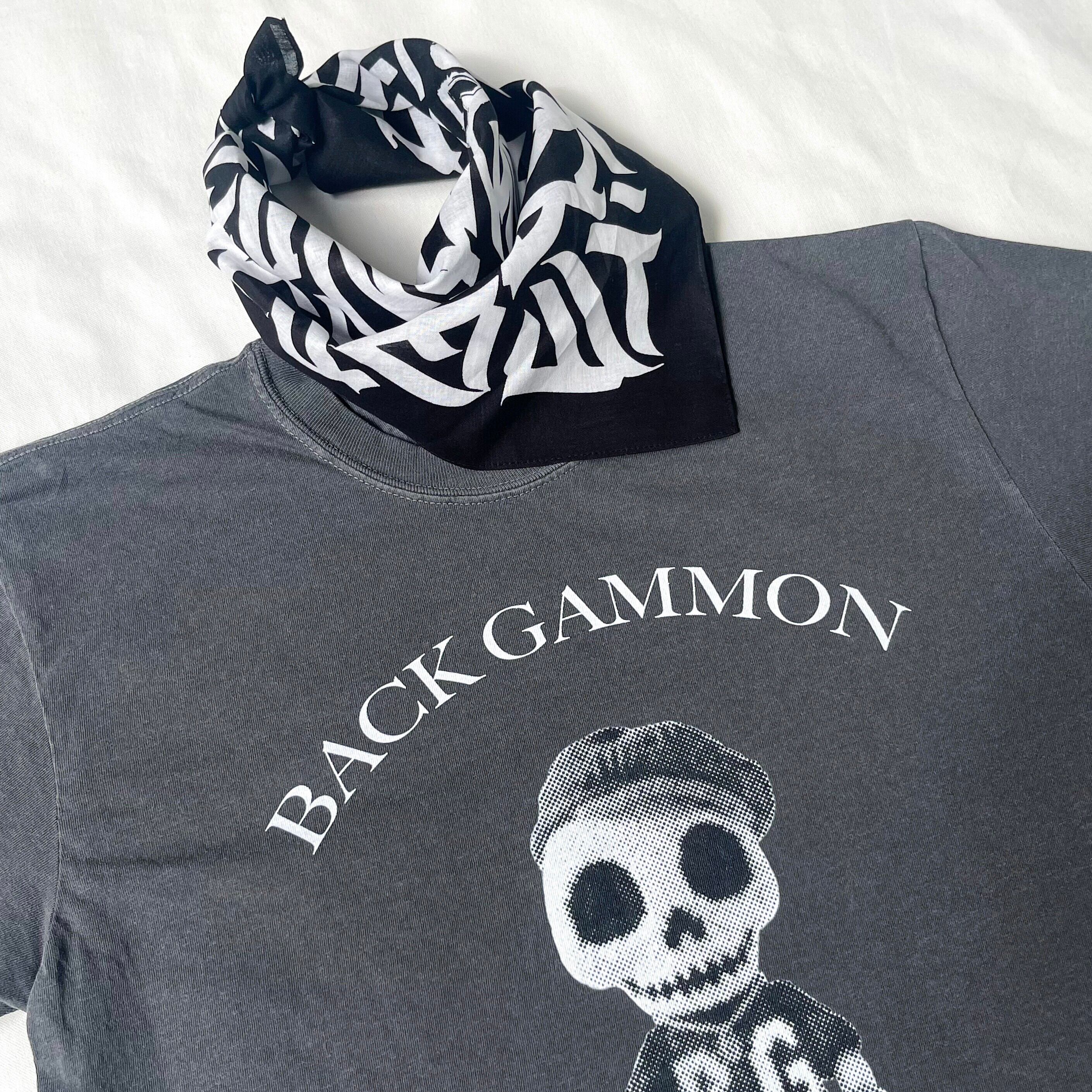 商品説明:タギングの総柄プリントにステンシルアートで描かれたBACK GAMMONの文字が入ったバンダナ!